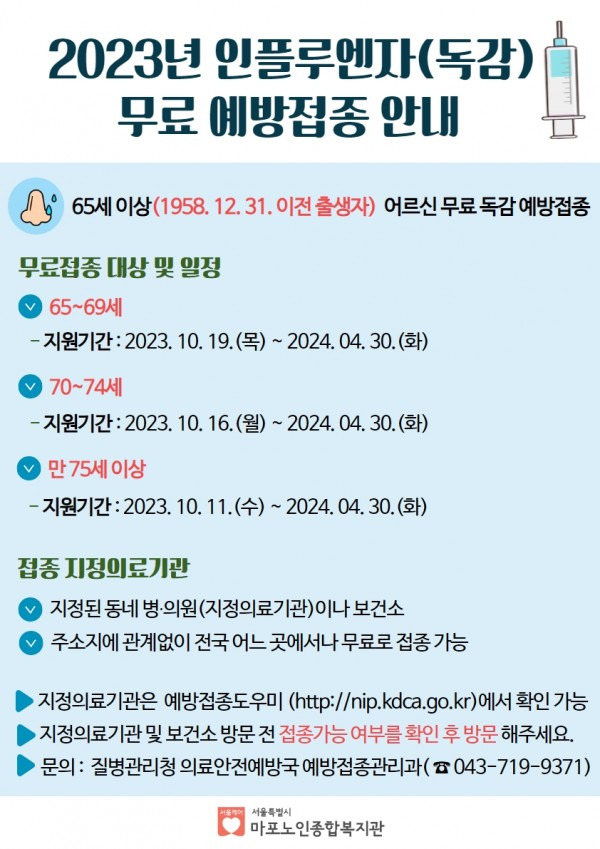 2023년에는 만 65세 이상의 노인을 대상으로 한 무료접종이 시행됩니다. 이 프로그램은 노인들이 독감으로 인한 건강 문제를 예방하고, 더 나아가 사회 전체의 건강을 증진시키는 데 기여하고 있습니다.