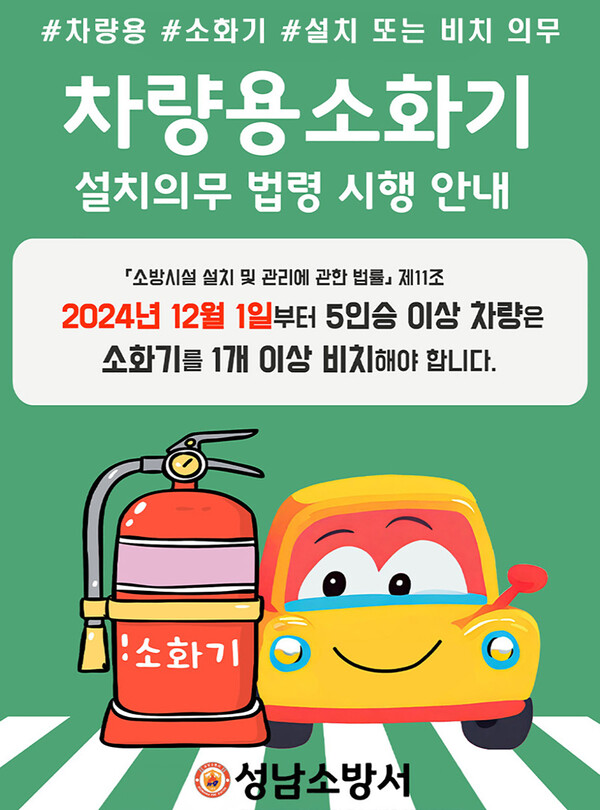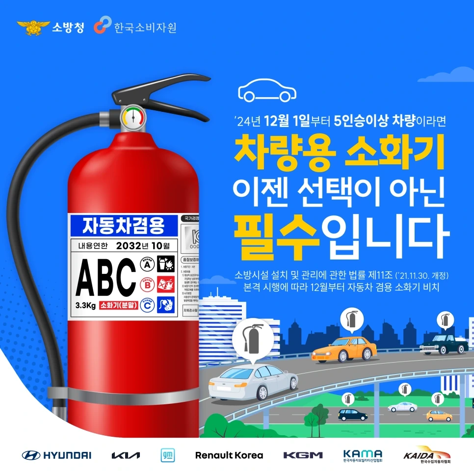 2024년 12월 1일부터 5인승 이상의 차량에 차량용 소화기를 의무 설치해야 한다는 법안이 시행됩니다. 이는 차량 화재 예방을 위한 정부의 강력한 조치로, 이제는 법적으로도 소화기를 갖추지 않은 차량은 운행할 수 없게 됩니다. 이에 따라 소화기를 구입하고 설치하는 것이 더욱 중요해졌습니다. 차량 소화기의 무게는 보통 3.3kg으로, ABC 분류의 소화기만 사용해야 하며, 차량 안전을 지키기 위한 필수 아이템으로 자리잡고 있습니다.