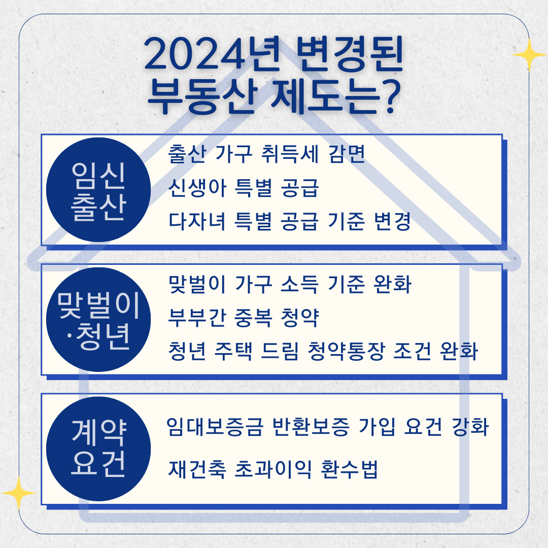 [3] YouTube - 2024년 바뀐 부동산 정책, 딱 3가지만 알려드려요 (https://www.youtube.com/watch?v=AQPDgeDsTiw)